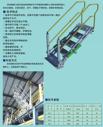 采用先進的活動踏步框架,用彈簧缸作為平衡操作使用方便。踏步條采用格柵扳結(jié)構(gòu),防滑性能好,并采取熱浸鋅處理,防銹性能良好。愛德活動梯有二步、三步、四步、五步,能滿足不同站臺和槽車間距的跨接。愛德活動梯另有獨特的腳踏彈簧鎖緊機構(gòu)以及鏈條保護機構(gòu)。其所有轉(zhuǎn)動部位,都用軸承或軸與尼龍?zhí)走B接,減少了磨擦阻力,所以操作輕便。